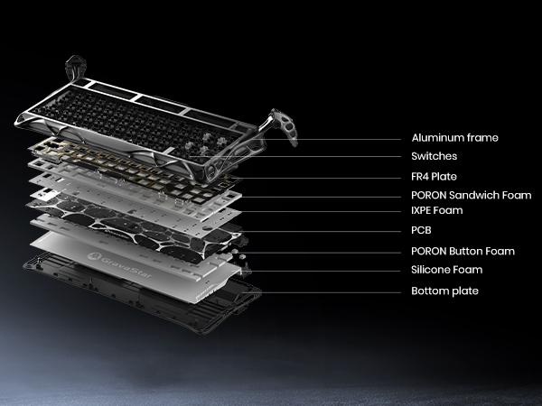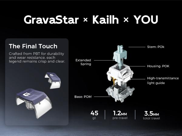 Gasket-mounted FR4 Plate provides a balanced typing feel, while custom GravaStar x Kailh linear switches offer fast, responsive keystrokes with quick rebound. Rated for 70,000,000 keystrokes, these switches deliver a smooth, crisp sound with no lubing required.